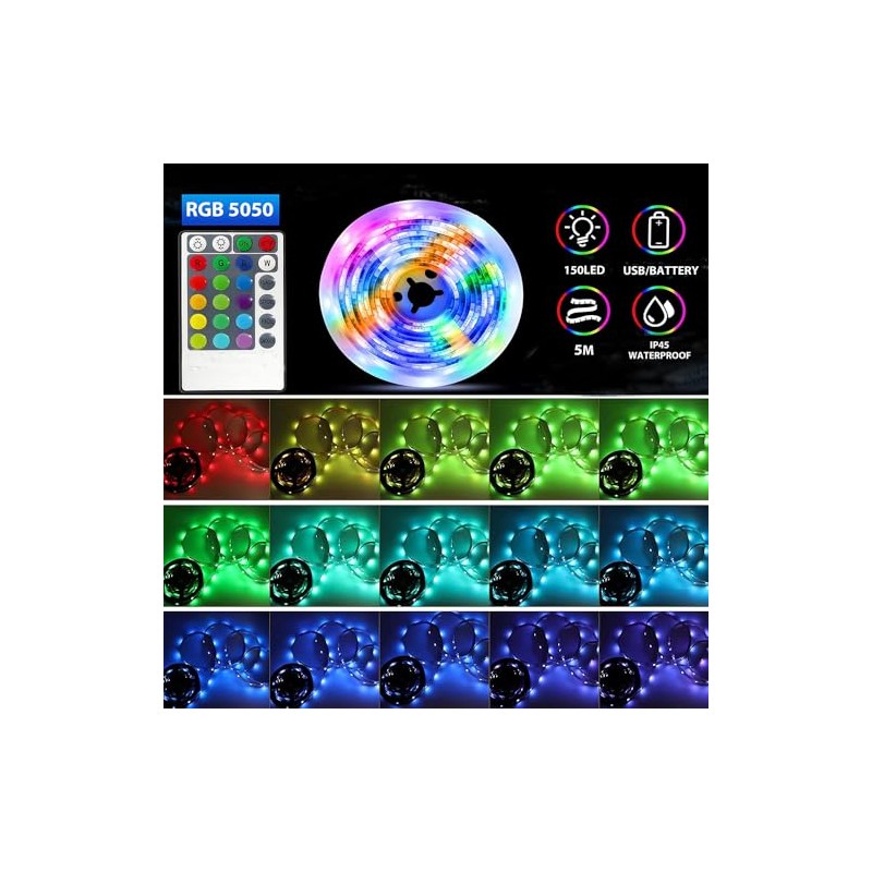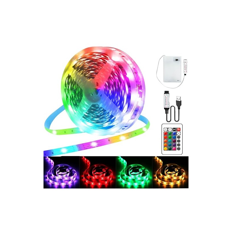 Kimuwote LED Streifen Batterie, 5M RGB 5050 LED Strip Batteriebetrieben oder USB Betrieben, Fernbedienung Dimmbar 16 Farben Ledband Selbstklebend fr TV Hintergrundbeleuchtung Deko, Zuhause PartyDeko