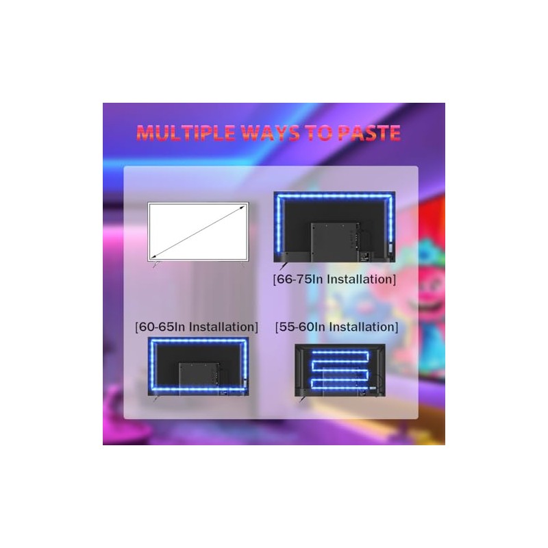 - Einfache Installation: Der RGB LED strip hat einen hochfesten Klebstoff, mit dem Sie problemlos auf jeder sauberen, trockenen und glatten Oberfl?che haften k?nnen. Es kann auch nach unterschiedlichen Gr??enanforderungen zugeschnitten werden (Vorsicht beim Schneiden).