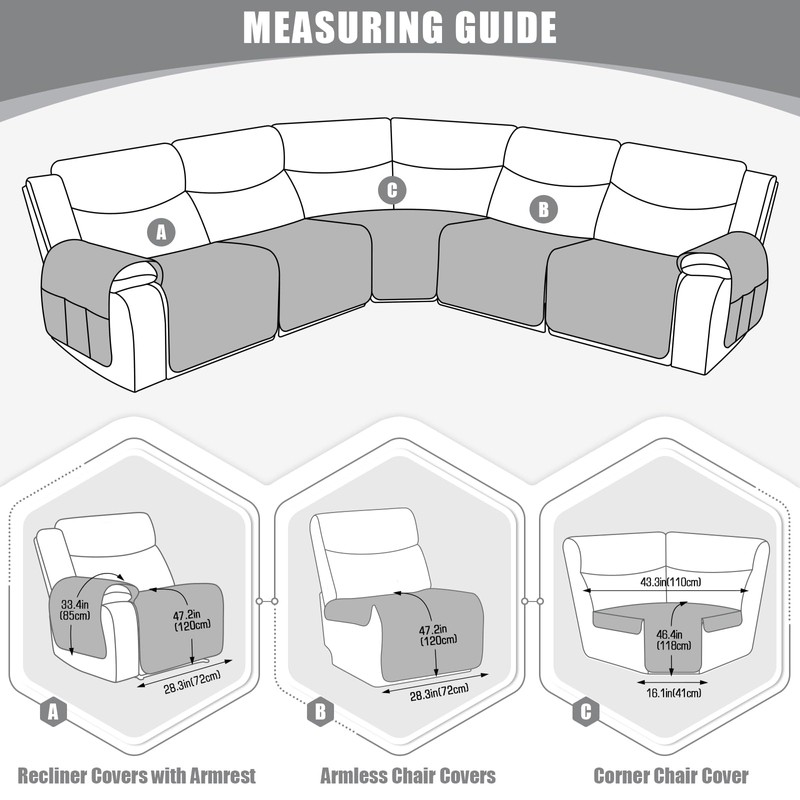 - Multiple Size Options: Our 5 piece L shaped sectional sofa cover consists of 5 separate pieces, including 2 recliner covers with arms, 2 armless chair covers, and 1 corner cover. Suitable for recliner seat with the width of each chair to 28 ". Please measure the size of your sofa before purchase, follow the Instructions to make sure that our recliner couch covers can match your sofa