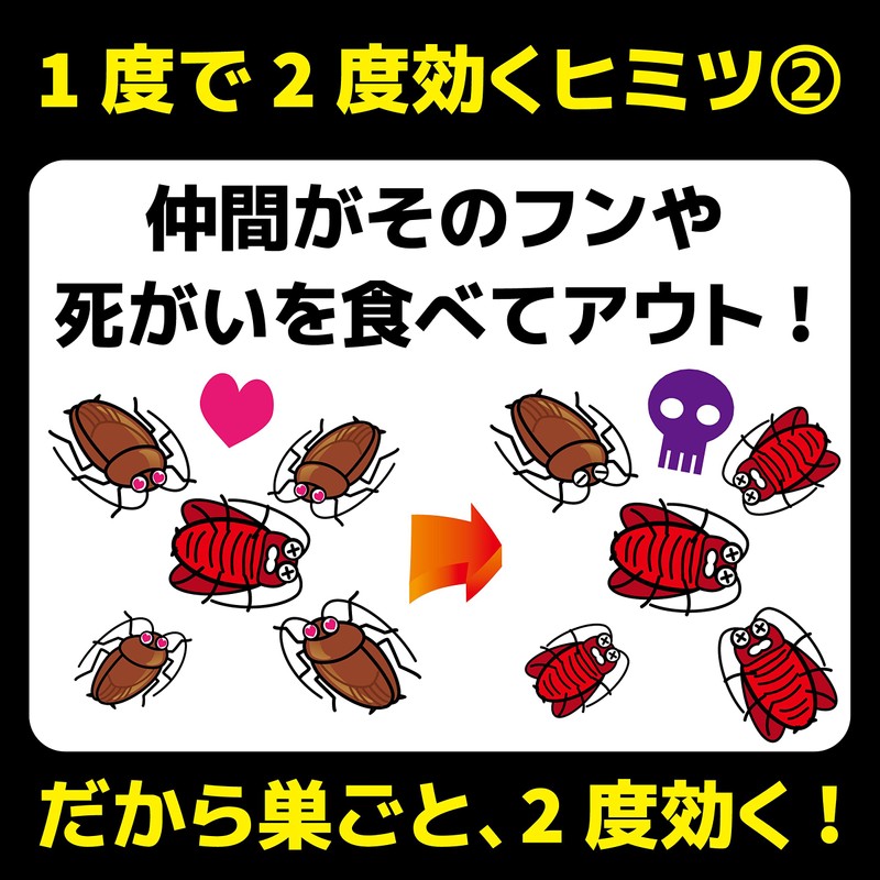 - 1しぶとい抵抗性ゴキブリに効く2大型・小型、どんなゴキブリにも効く3メスの卵に効く42度効く、巣ごと効く5プロが使う速効成分、その日から効く6小型でも、広く効く7入りやすい内部デザインの容器8固定テープ付き