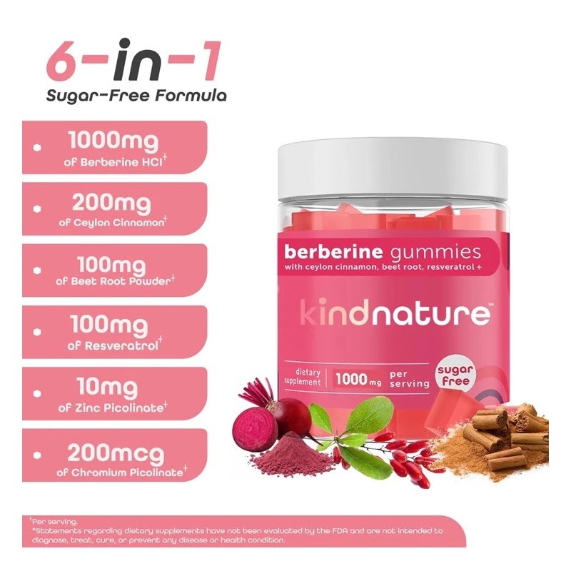 Good-For-You Gummies – Kind Nature berberine supplement gummies are sugar-free, non-GMO, vegan, gluten-free, soy-free, low-calorie & naturally flavored with a delightful mixed-berry taste