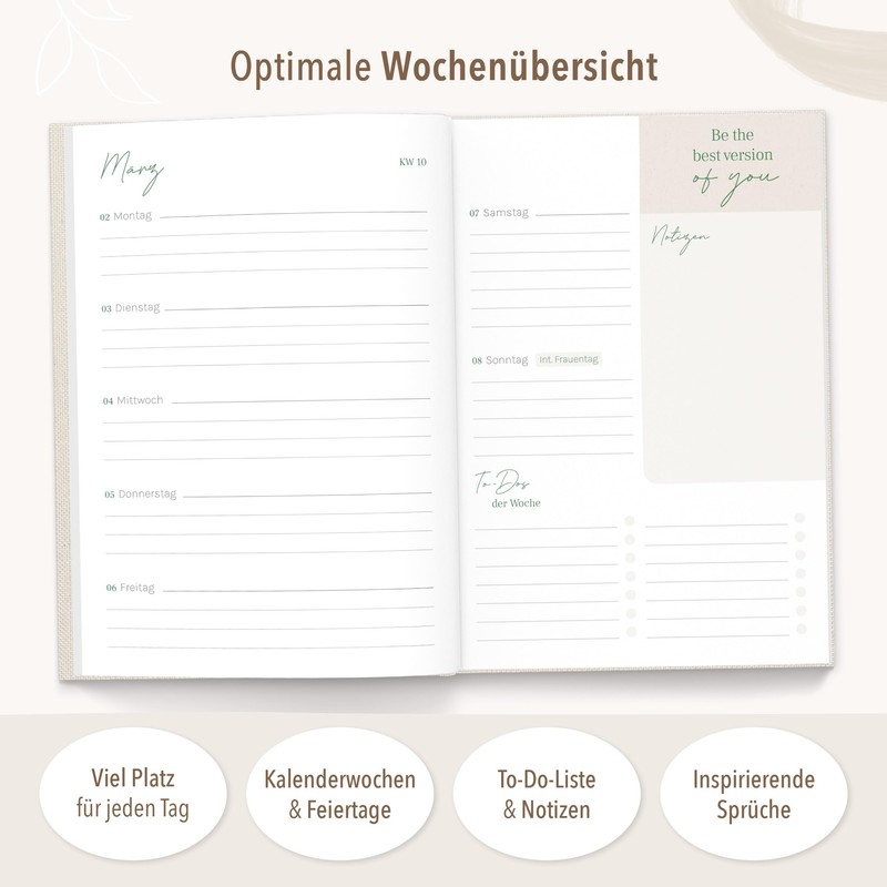 Sophisticated and suitable for everyday use: per calendar week you can expect a clear double page with space for appointments, notes and to-dos. Monthly specials on mindfulness & self-love, reflection pages and motivational affirmations help you stay focused and build routines.