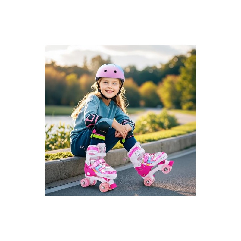 Verstellbare Skates – Die Mädchen Rollschuhe können zwischen vier Größen eingestellt werden. Sie können die Streifen, Schnalle, Schnürsenkel öffnen und dann den "Push"-Knopf drücken und an der Schuhspitze ziehen, um die Größe anzupassen. Lassen Sie den "Push"-Knopf los, um alle Anpassungen zu sperren.