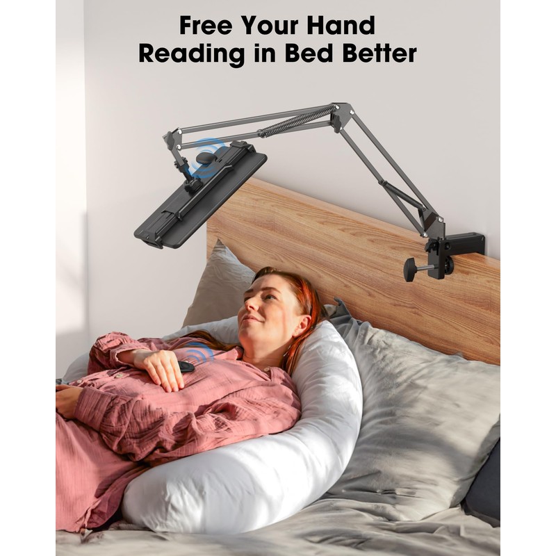 - 【Quality and Stable Kindle Stand】The arms of QIWAS kindle holder are anti-vibration spring-loaded arms. The kindle stand is made of metal and ABS plastic so that it more sturdy and stable. Besides, the base is designed with four mounting holes for two different mounting modes, so you can mount the base on the tabletop vertically or the headboard horizontally. There is a ball connector on the top of the tablet stand to support 360-degree rotation to meet the needs of reading in different scenarios like sitting on the couch and lying in bed.