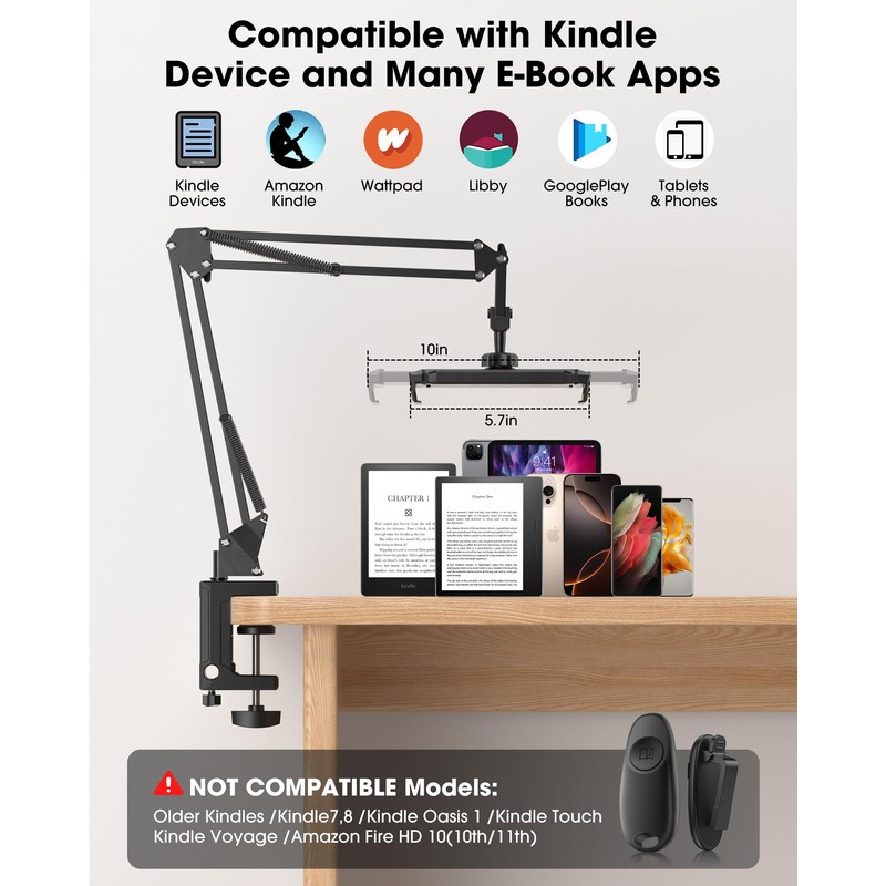 - 【Wider Device Compatibility】Whether you are sitting, lying or standing, QIWAS kindle holder with remote page turner can help you to read without touching the screen. The width of the kindle clip can be extended from 5.7” to 10”. The base can be fixed to a flat tabletop or headboard with a thickness of less than 2.3”. The QIWAS kindle stand with page turner is suitable for most kindles and tablets. It also works with Kobo and other capacitive touchscreen eReaders devices, which makes the kindle holder with page turner an ideal reading accessories. NOT COMPATIBLE MODELS: Older Kindles /Kindle7,8 /Kindle Oasis 1 / Kindle Touch/Kindle Voyage / Amazon Fire HD 10(10th/11th).