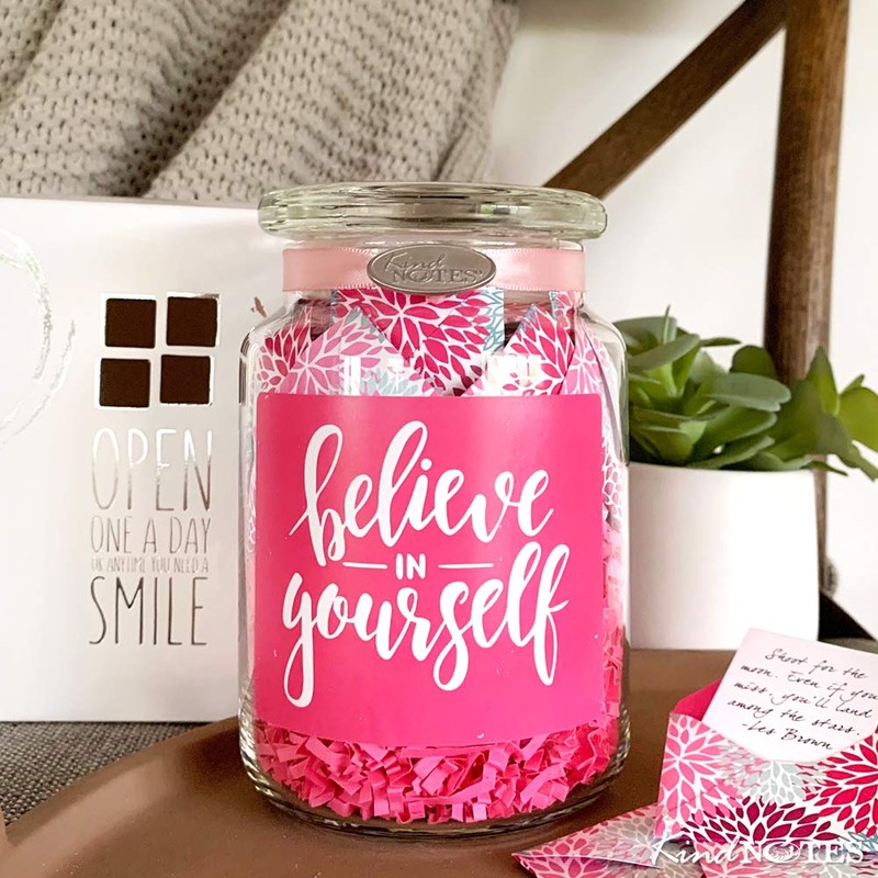 KindNotes Glass Keepsake Gift Jar with Away to College Messages - Floral Puffs Believe in Yourself Design