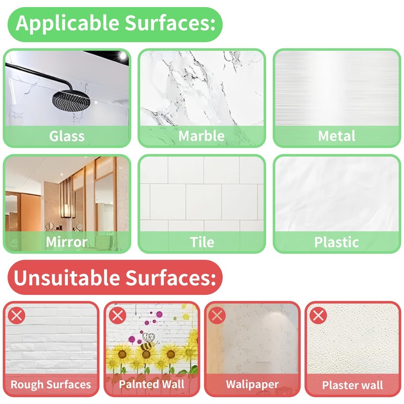 • For smooth surface: Sucker hooks for bathroom hold well on flat and smooth surface like glass, mirrors, glazed bricks, ceramic tiles, metal, marble, plastic, and acrylic. Can be used on door, window or side of kitchen cupboards. Not suitable for dusty and uneven lime walls, painted walls, wallpaper, logs, etc.
