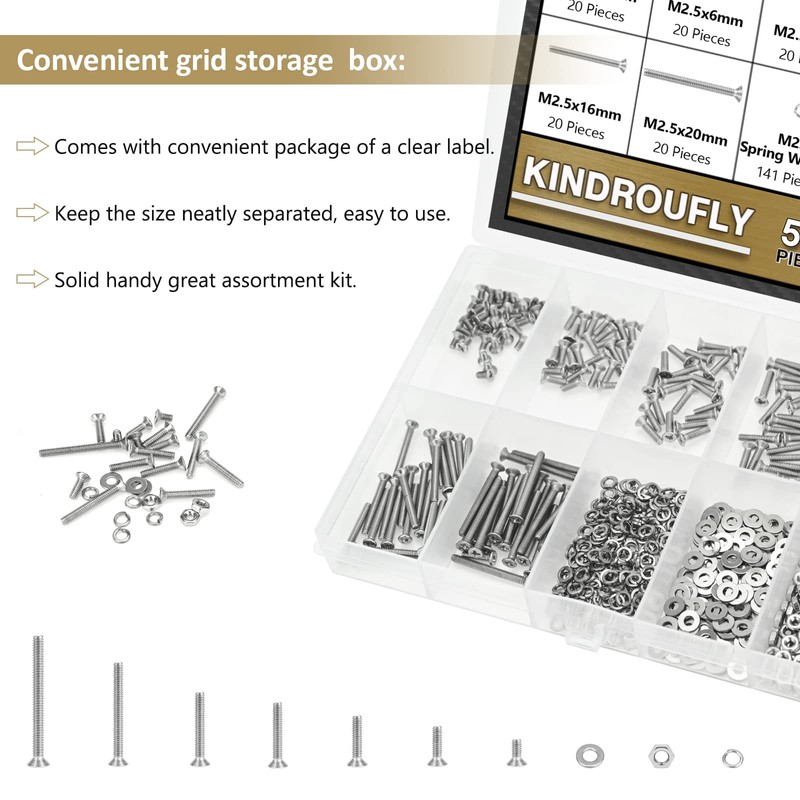 Kindroufly 562 Pieces M2.5 x 4/6 /8/10 /12/16 /20mm Phillips Countersunk Head Machine Screws Nuts Washers Assortment Kit, 304 Stainless Steel, Fully Machine Thread