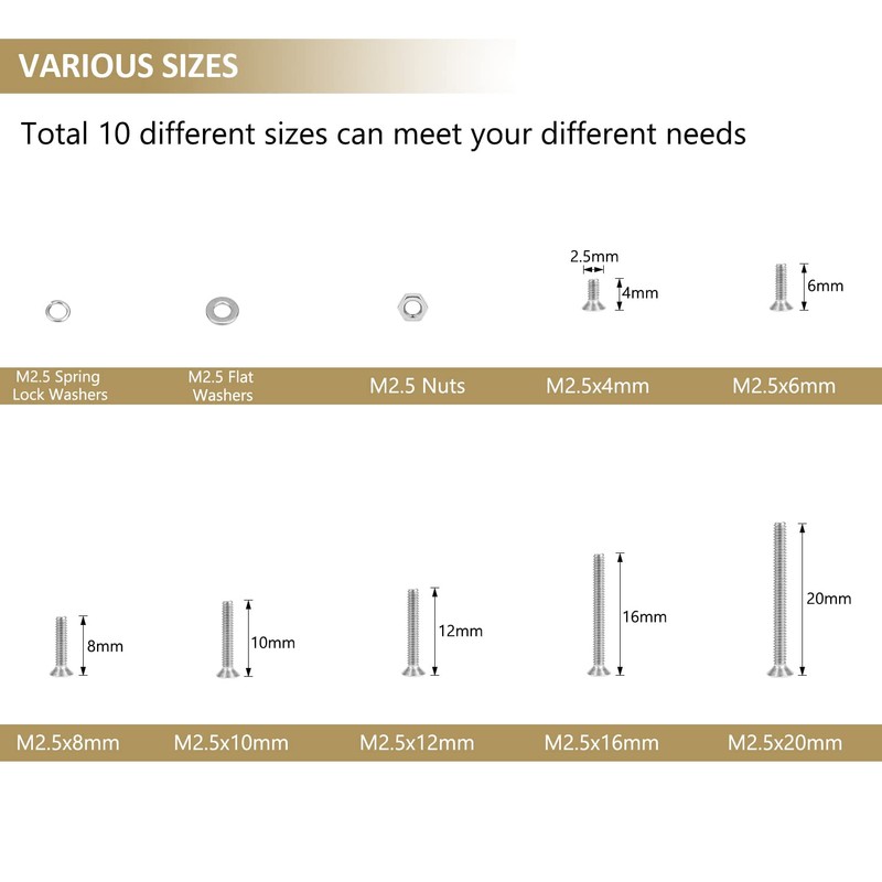 - √【Kindroufly Combination】: M2.5 x 4 /6 /8 /10 /12 /16 /20mm phillips countersunk Head machine screws with matching hex nuts, spring lock washers and flat washers, total 562 pieces, different sizes and enough quantities can meet your different daily needs.