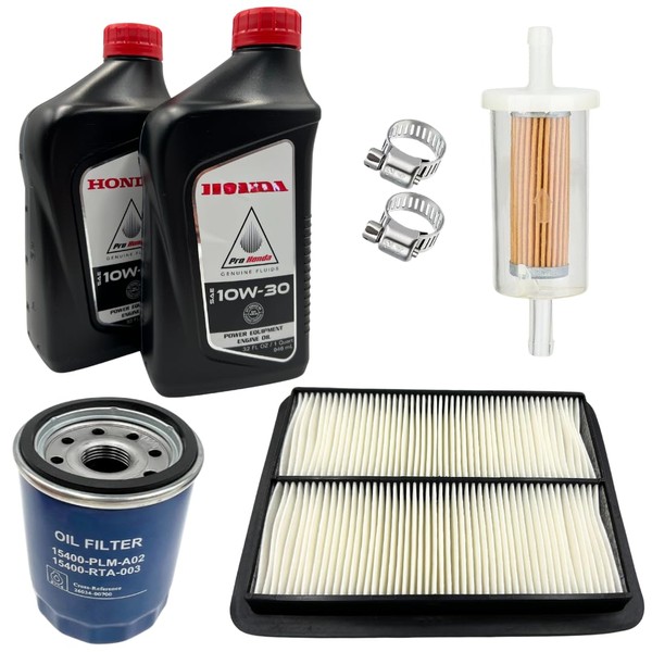 - KIT CONTENTS: 2 Quarts GENUINE OIL [08207-10W30], AIR FILTER REPLACEMENT 17210-Z6M-010 , Replacement Oil filter 15400-PLM-A02 15400-RTA-003 , Replacement Inline Fuel Filter 695666 , 2 Worm clamps 6-12 mm