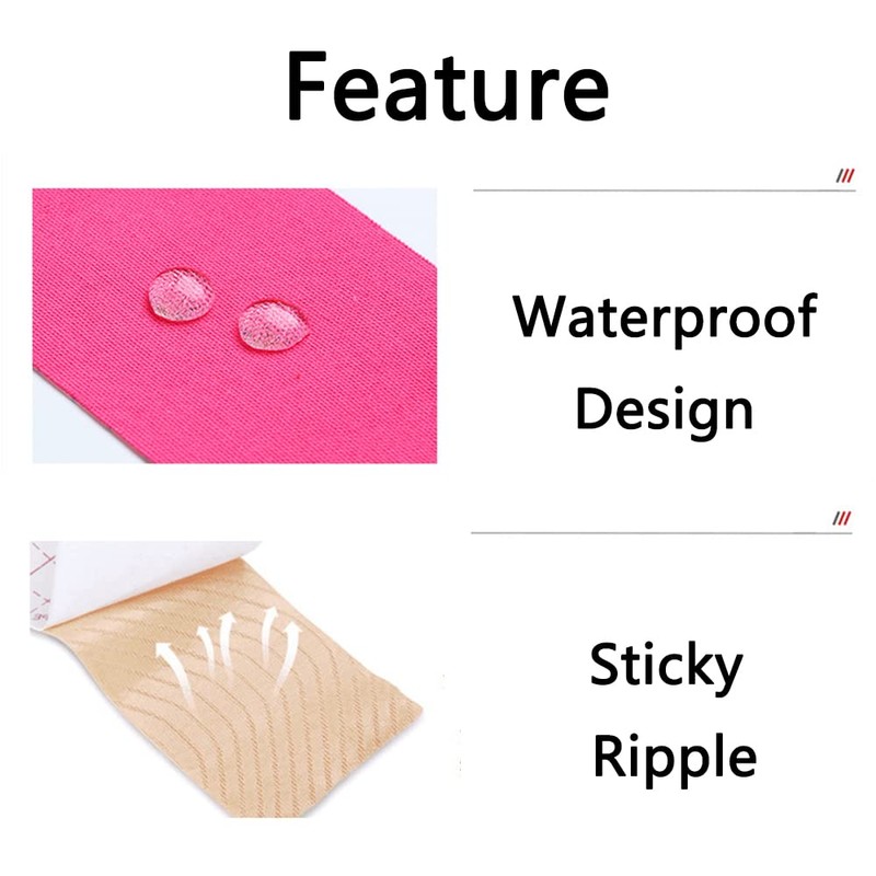 BREATHABLE & WATERPROOF MATERIAL Made of high quality latex free polyester, with breathable ripple design and water resistant surface. Kinesiology tape is of great elasticity, able to stretch up to 50% of its original length while maintaining its elasticity.