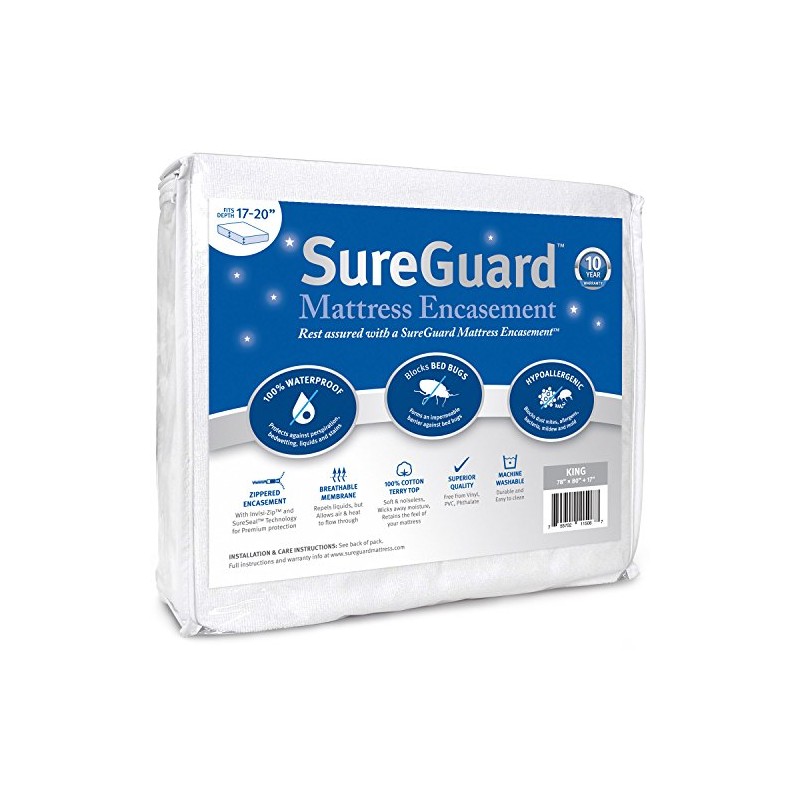 - 100% Waterproof - Six-sided premium mattress protector blocks perspiration, bed wetting, liquids and stains; 10-year quality guarantee (NOTE: For frequent accidents and easy clean-ups, place a fitted SureGuard Mattress Protector over the encasement).