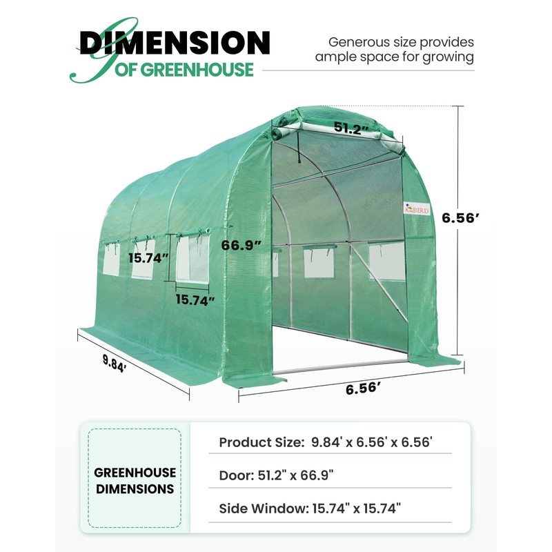 KING BIRD Premium 10x6.6x6.6FT Greenhouse for Outdoors, Large Walk-in Heavy Duty Galvanized Steel Frame, Mesh Door Screen Window Tunnel Hoop Garden Plant Winter Hot House, with Watering Kits, Green