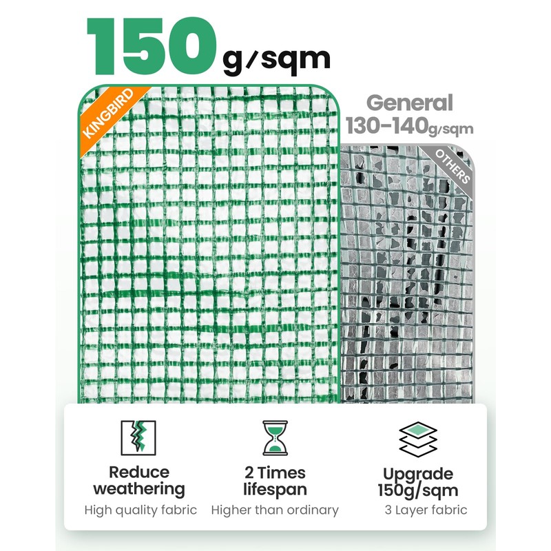 - [Sturdy UV Resistant PE Cover] - The 150g/sqm PE grid cover of KING BIRD portable greenhouse is reinforced, waterproof, and odorless with the UV stabilizer, a specialized addition that effectively reflects harmful rays and extends the service life of the cover. It has been designed to fit the frame closely, enhancing warmth and wind resistance in winter to protect your plants for as long as possible.