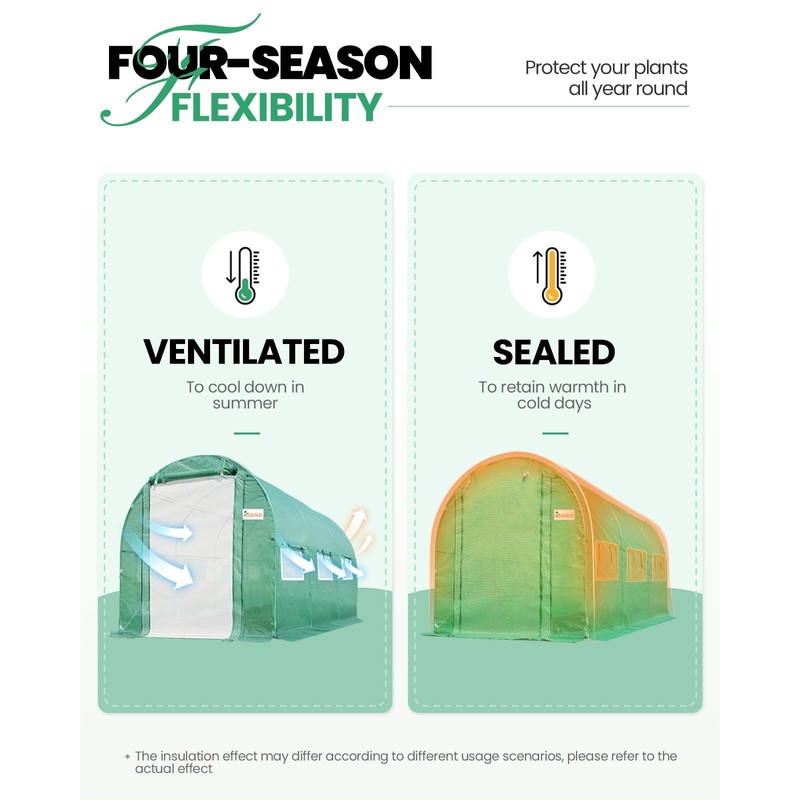 - [Versatile for Efficient Temperature Management] - Convenient 2 entrances with multifunctional PE and zippered screen doors. Plus, 6 roll-up screen windows for cross-ventilation, temperature, and humidity control. Enhance ventilation on hot days and keep warm in winter, providing a better environment for your plants and keeping out the pets.