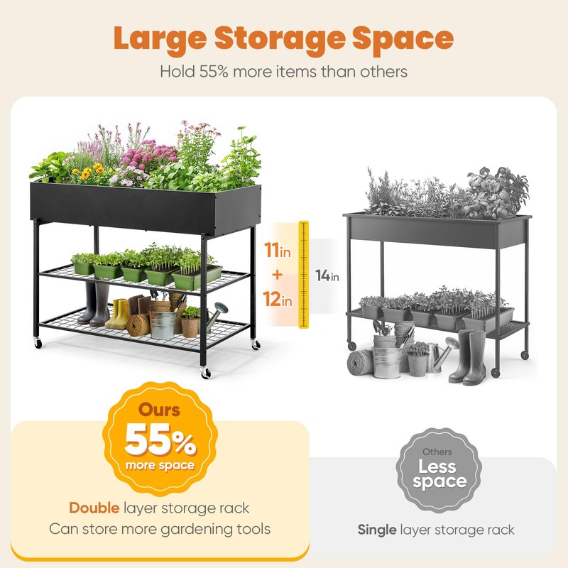 - 【Space-Saving Dual-Layer Storage】Engineered with a heavy-duty galvanized steel frame system to keep your pots, tools, and fertilizers perfectly organized. Maximizes vertical space on patios/balconies while delivering 55% more storage than single-tier raised garden bed kit.