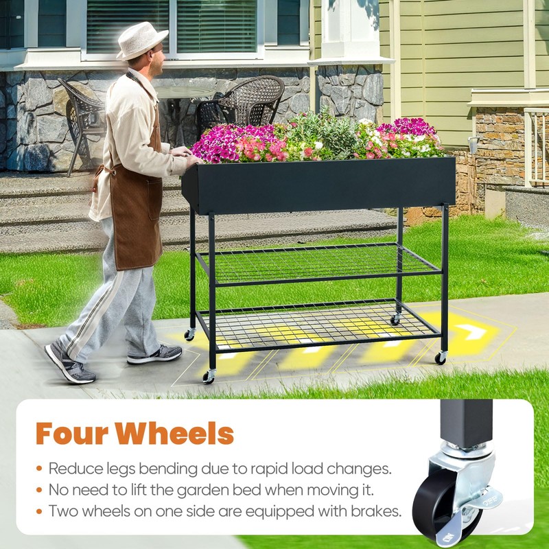KING BIRD Raised Garden Bed with Legs & Double-Layer Storage Shelf, Galvanized Elevated Planter Box with Lockable Wheels for Backyard, Patio, Balcony, 400lb Capacity, Black, 48x24x38 in