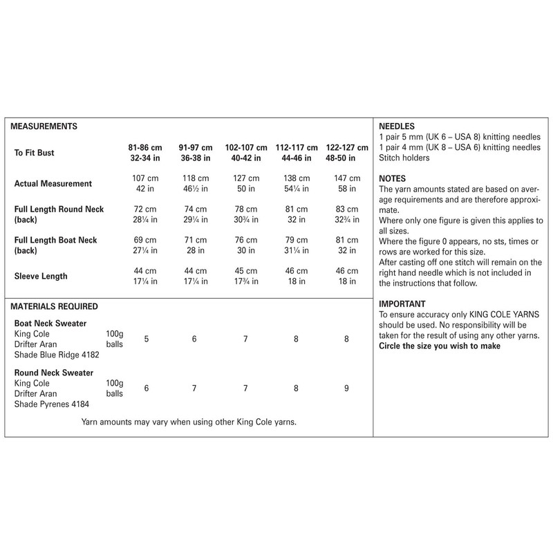 - The yarn requirements for the garments in this leaflet are as follows: Boat Neck Sweater to fit bust 32" - 34" [36" - 38": 40" - 42": 44" - 46": 48" - 50"] use King Cole Drifter Aran 100g - Blue Ridge (4182) 5 [6: 7: 8: 8] balls. Round Neck Sweater to fit bust 32" - 34" [36" - 38": 40" - 42": 44" - 46": 48" - 50"] use King Cole Drifter Aran 100g - Pyrenes (4184) 6 [7: 7: 8: 9] balls.