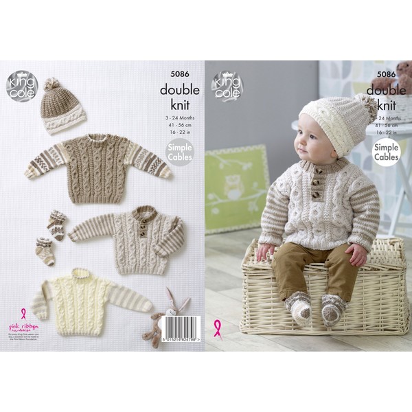 King Cole Baby Double Knitting Pattern Simple Cable Sweaters Hats & Socks (5086),Multicolor,16" - 22" chest