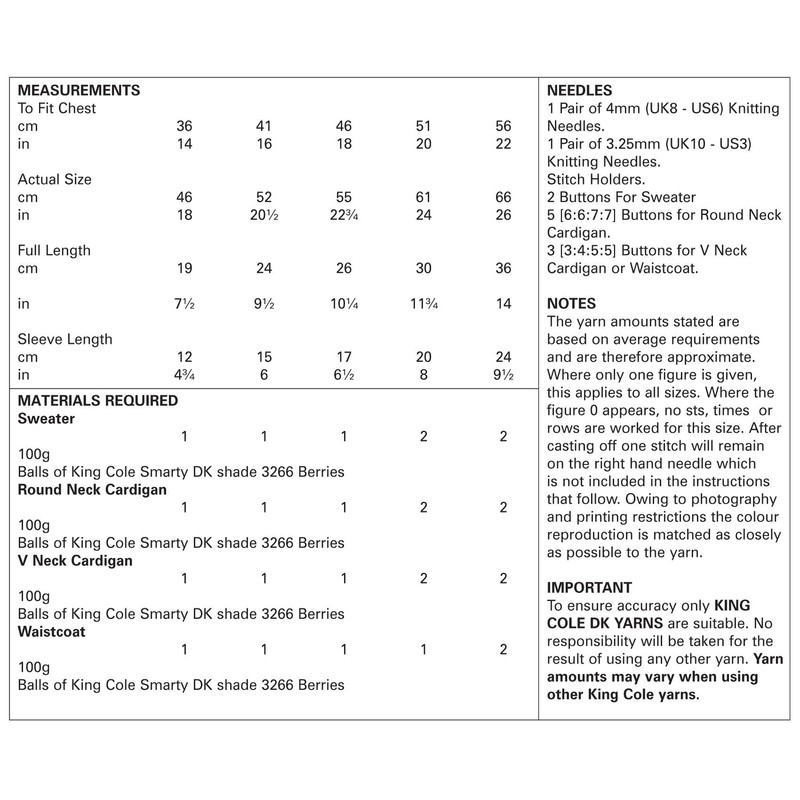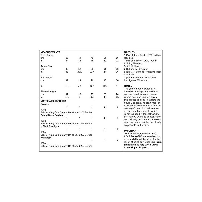 • This King Cole knitting pattern is suitable for use with most double knit yarns, however tensions may vary and we recommend you knit a tension square before knitting the whole garment.