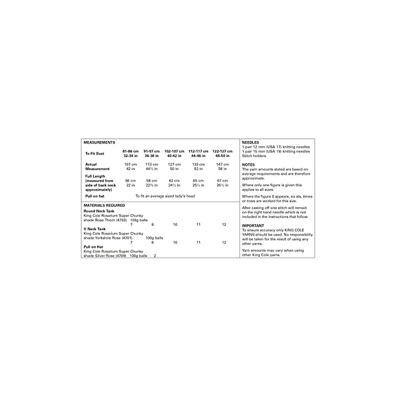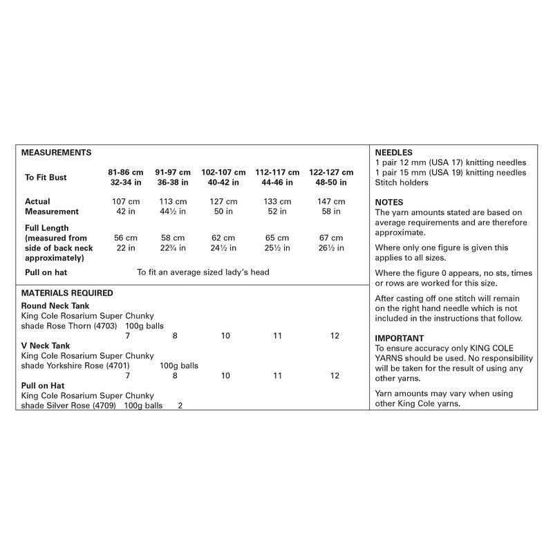 - The yarn requirements for the garments in this leaflet are as follows: Round Neck Tank Top to fit bust 32" - 34" [36" - 38": 40" - 42": 44" - 46": 48" - 50"] use King Cole Rosarium 100g - Rose Thorn (4703) 7 [8: 10: 11: 12] balls. V Neck Tank Top to fit bust 32" - 34" [36" - 38": 40" - 42": 44" - 46": 48" - 50"] use King Cole Rosarium 100g - Yorkshire Rose (4701) 7 [8: 10: 11: 12] balls. Hat to fit Average Woman's Head use King Cole Rosarium 100g - Silver Rose (4709) 2 balls.