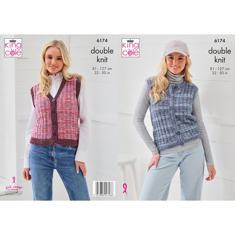 King Cole Women’s Knitting Pattern Double Knit Ladies Round and V-Neck Waistcoats (6174), 32” – 50” (81cm – 127cm)