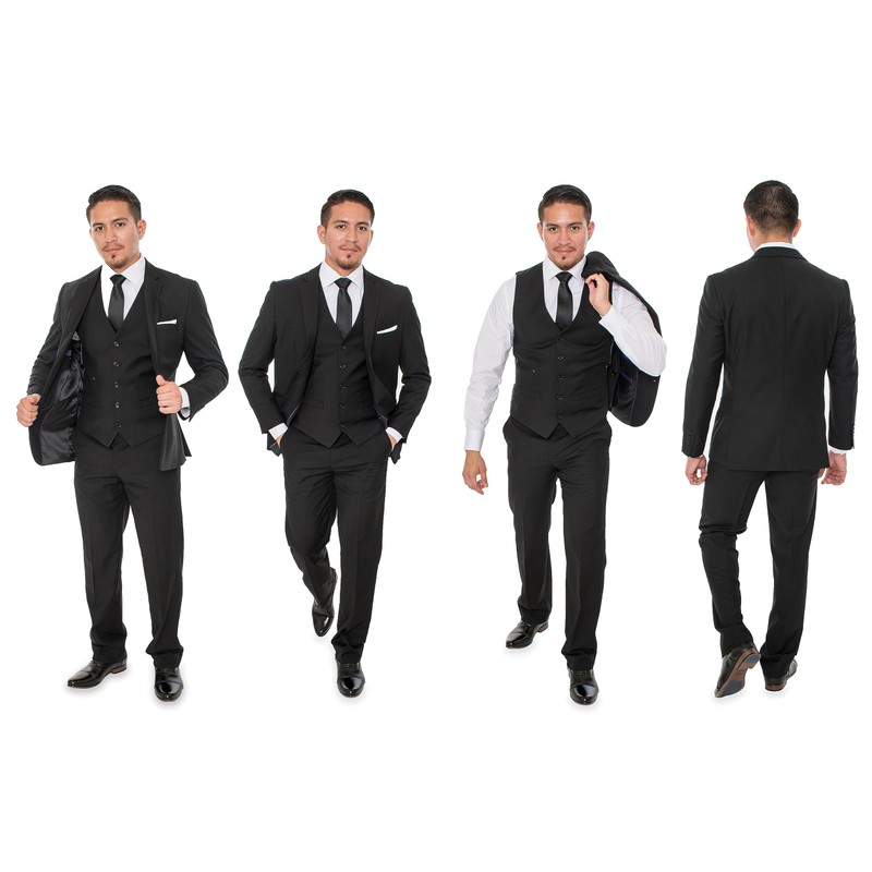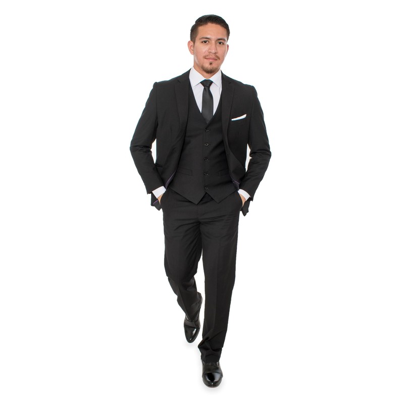 Men’s Premium Three-Piece Suit Set, Italian Design/ Super 180's/ made from premium Rayon, Viscose, Dacron 65% 35% with Tetron Silk Lining, This Elegant Suit is, Modern Fit, featuring popular Notch Label, with Two Buttons. Includes matching jacket, vest & pants. Jacket: Solid – 2 button front closure – Notch lapel – Double Side vents – Interior pic-stitching – Interior French facing – Fully lined - Two besom front pockets with flap closure – Three interior pockets for all of your gentlemen needs including cell phone pocket, wallet pocket & pen pocket – Arm hole stretch – underarm sweat guards. Pants: Flat front – Unhemmed bottoms allow you to customize the perfect length & style. The pants come with zipper & button closure. Two back besom pockets with button closure – two front aligned slip pickets pockets – Lined to the knee – Zip fly and extended button closure on waistband. Please keep in mind the pants come with a drop 6 (Drop 6 means minus 6” from your selected jacket size. For example: Size 44 jacket is pre-paired with size 38 waist pants.) All pants have 37” inseam. All the pants have 2” of extra material in the waist that a tailor could easily adjust and make the pants 2 “ bigger or smaller in waist, for example 34” pants could easily be made in to 32” waist or as big as 36” waist. Vest: 6 buttons with 2 pockets, featuring adjustable back. Dry Cleaning is recommended. Includes a FREE Suit Bag & hanger, In Stock Program/Year Around. Please contact us if you need help figuring out your perfect fitting suit size, we are more than happy to help you out!
