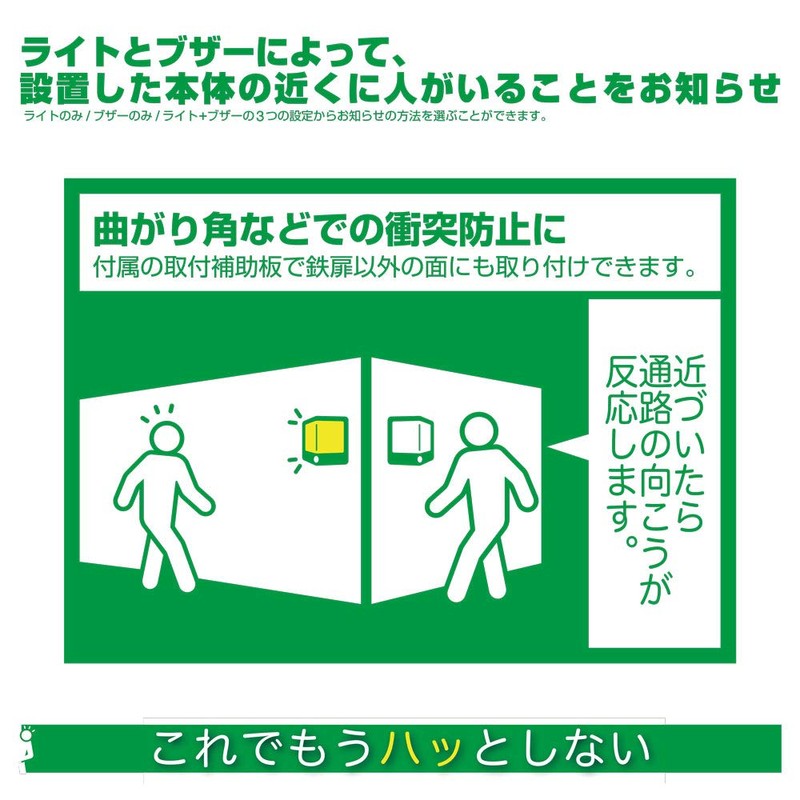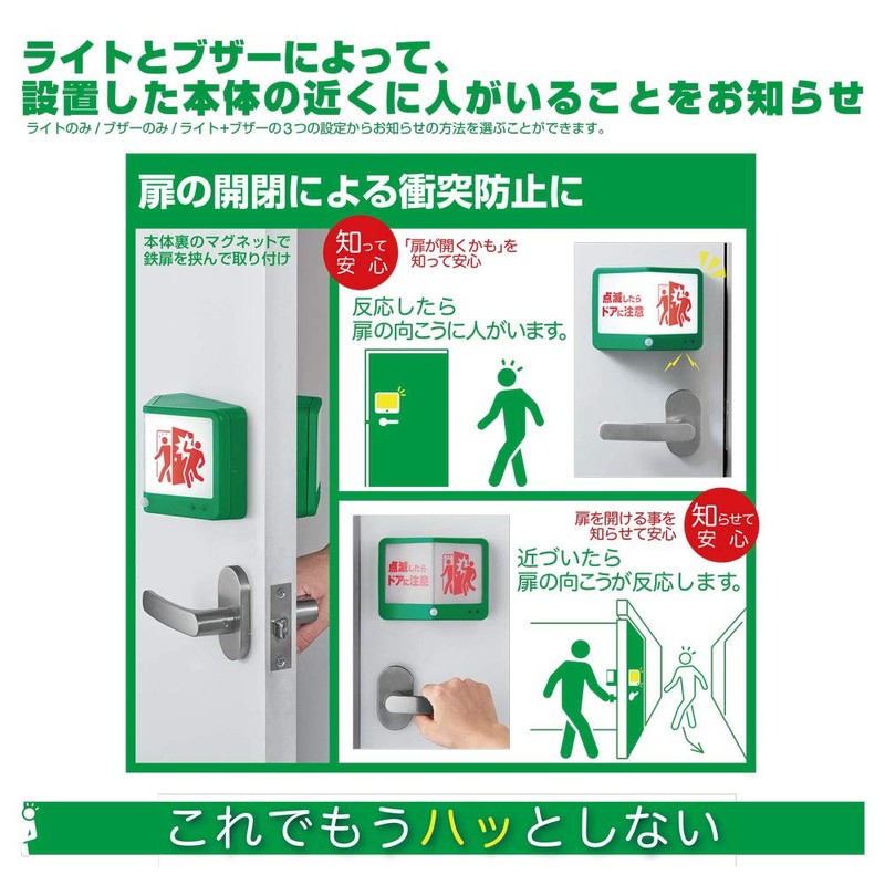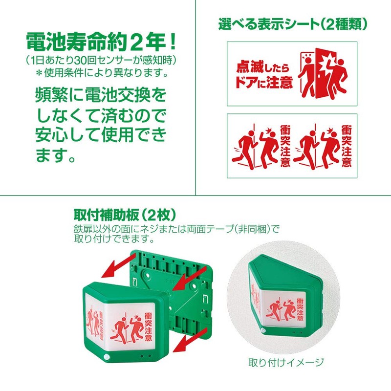 - ●サイズ(mm):140×75×105●取付仕様:マグネット、ねじ・両面テープ(別売)●表示内容:点滅したらドアに注意または衝突注意●電源:単2形アルカリ乾電池×8本(別売・1台あたり4本)