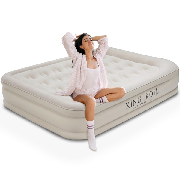 King Koil Luxury Air Mattress 16in Full Size Beige with Built-in Pump for Home, Camping & Guests-Inflatable Airbed Luxury Double High Adjustable Blow Up Mattress, Durable - Portable and Waterproof