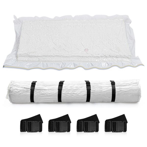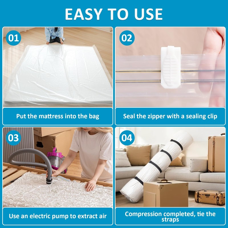 • SPACE SAVER VACUUM STORAGE BAGS: Our mattress vacuum sealing bags use compression technology to compress mattresses to a fraction of their original volume. The space inside the bag is sealed with clips and bound with straps to achieve a long-lasting compression effect, making the vacuum storage bags easier to carry and saving you more space. Not only are they easy to find, move, and store, but they can also be easily placed in your car, SUV, or transport box, saving you moving costs!