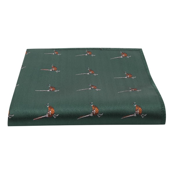 King & Priory Dark Green Herringbone Embroidered Pheasant Pocket Square, Handkerchief