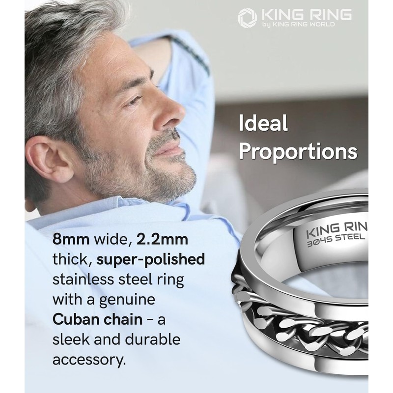 King Ring 8mm Fidget Ring – Spinner Stainless Steel Band for Men & Women with Cuban Chain K01 – Silver 13
