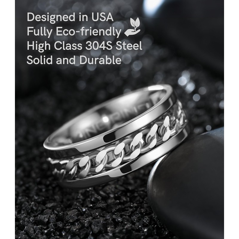 The integrated Cuban chain adds a unique touch to this stainless steel ring, elevating its appeal and making it a conversation starter. Whether you're in a meeting or waiting in line, the subtle spin of the fidget ring can help you stay focused and relaxed.