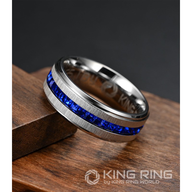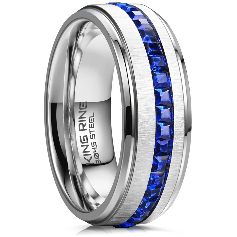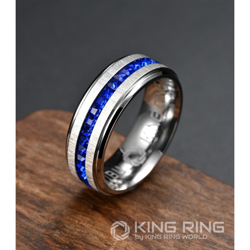 King Ring 8mm Stones Line Ring – Extra Polished Stainless Steel Mens Ring with Glass Stones Basic Wedding Band K36V2 – Silver Blue 12