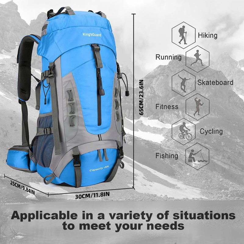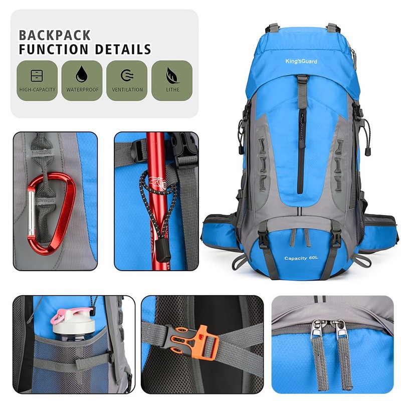 King'sGuard 60L Hiking Backpack Men Women Camping Backpack Waterproof Backpacking Mountaineering Climbing Daypack with Rain Cover (Blue)