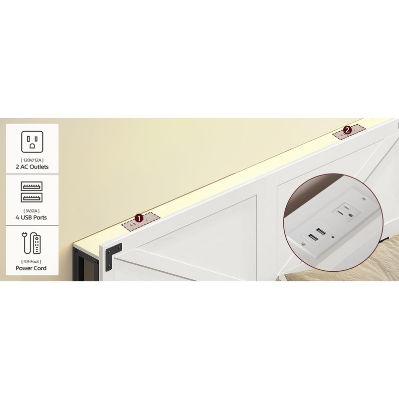 MAHANCRIS King Size Headboard Only, Headboard with 2 Outlets and 4 USB Ports, Farmhouse Headboard, with LED Lights, Secure Storage with Raised Fence, with Bed Frame Adapter, White and Black