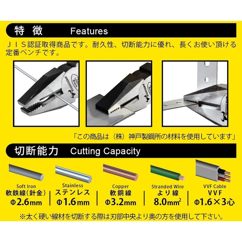 - Cutting Capacity: Stainless steel wire: Diameter 0.05 inch (1.2 mm), Iron wire: Diameter 0.06 inch (1.6 mm), Soft iron wire: Diameter 0.1 inch (2.6 mm), Copper wire: Diameter 0.1 inch (3.2 mm), Stranded wire: 0.2 inch (5.5 mm)