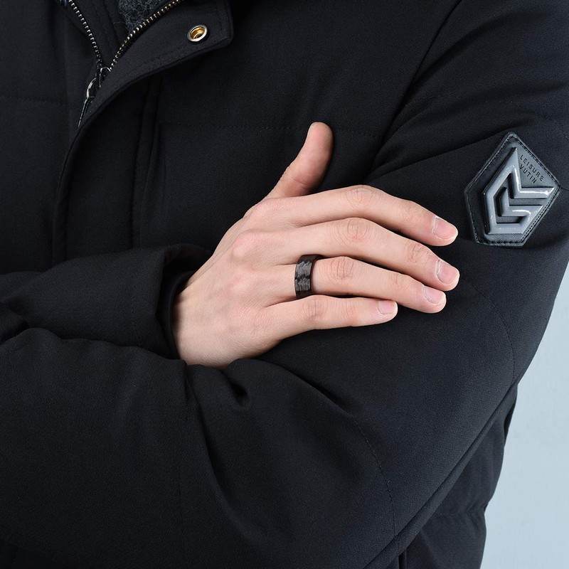 - SPECIAL DESIGN: 8mm Black Tungsten Carbide Ring Inner Hole Inlaid Wood Hammered Texture Flat Style suitable for men.