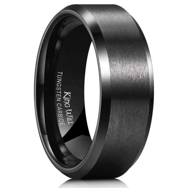 King Will 8mm Men's Black Wedding Ring - Brushed Matte Surface, Beveled Polished Edge, Comfort Fit Size 9