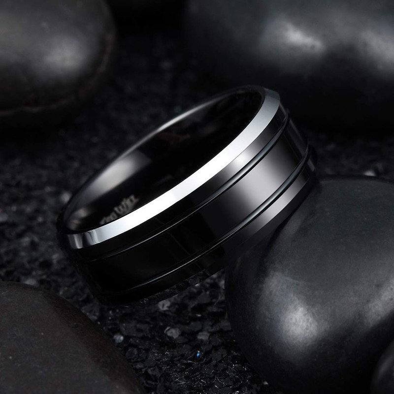 King Will Classic Men 8mm Black Tungsten Carbide Rings Polished Beveled Edge Double Groove Wedding Bands 7.5