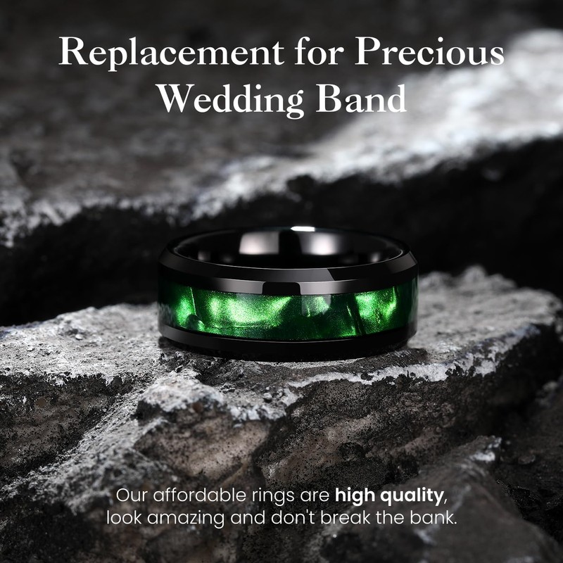 King Will Tungsten Carbide Wedding Band for Men - 8mm Black High Polished Inlay Green Shell Texture Patterns for Everyday Wear Comfort Fit 11.5