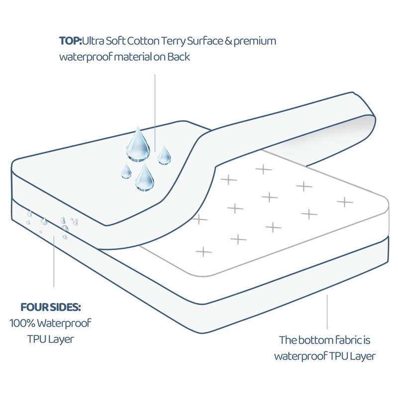Built to endure accidents, the 100% waterproof TPU backing repels liquids without trapping heat. Natural cotton terry cloth on top absorbs moisture and stays whisper-quiet.