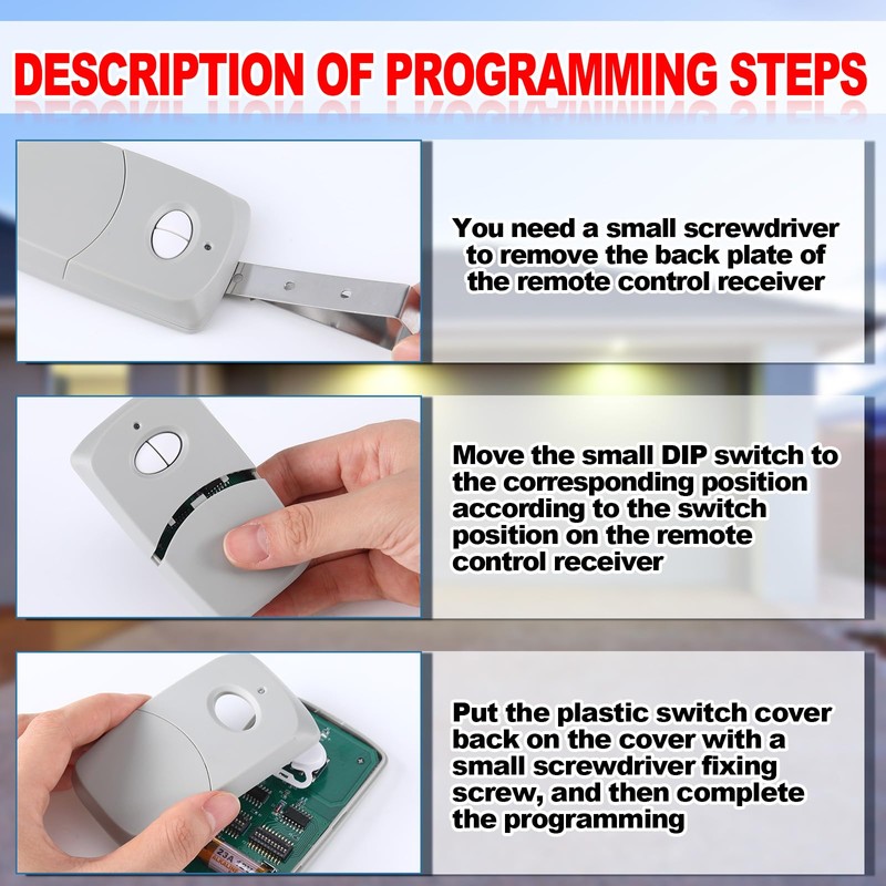 • Programming Instructions: garage door remote operates at 300MHz, has 10 DIP switch, clear instructions, simple programming; Before starting remote programming, make sure the garage door opener is completely closed