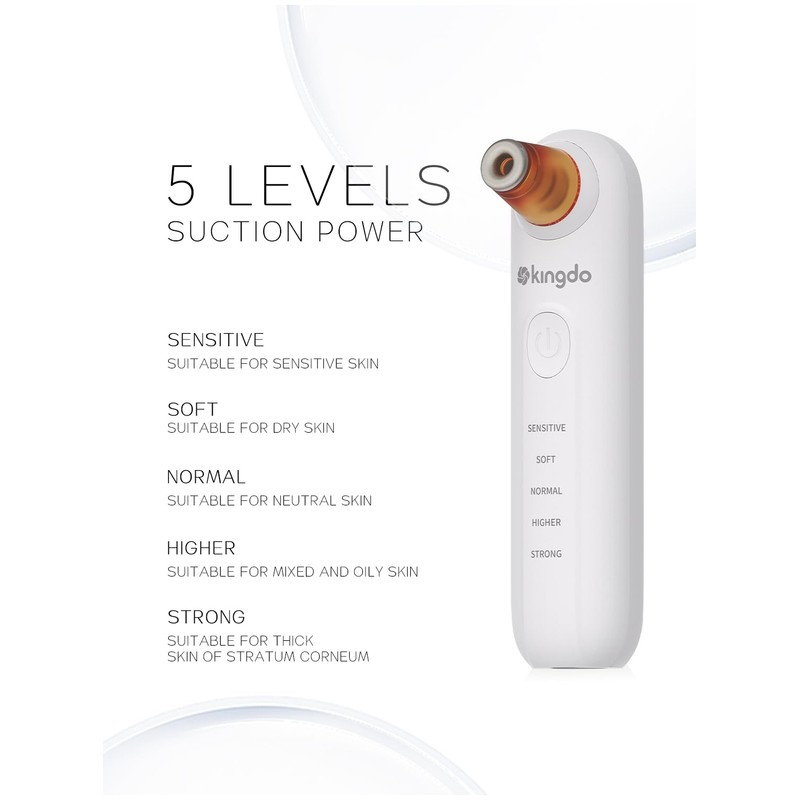 - 5 Suction Levels: Features 5 powerful suction levels for varying needs; Sensitive/Soft for delicate or dry skin; Normal for typical skin with less blackheads; Higher/Strong for mixed or oily skin