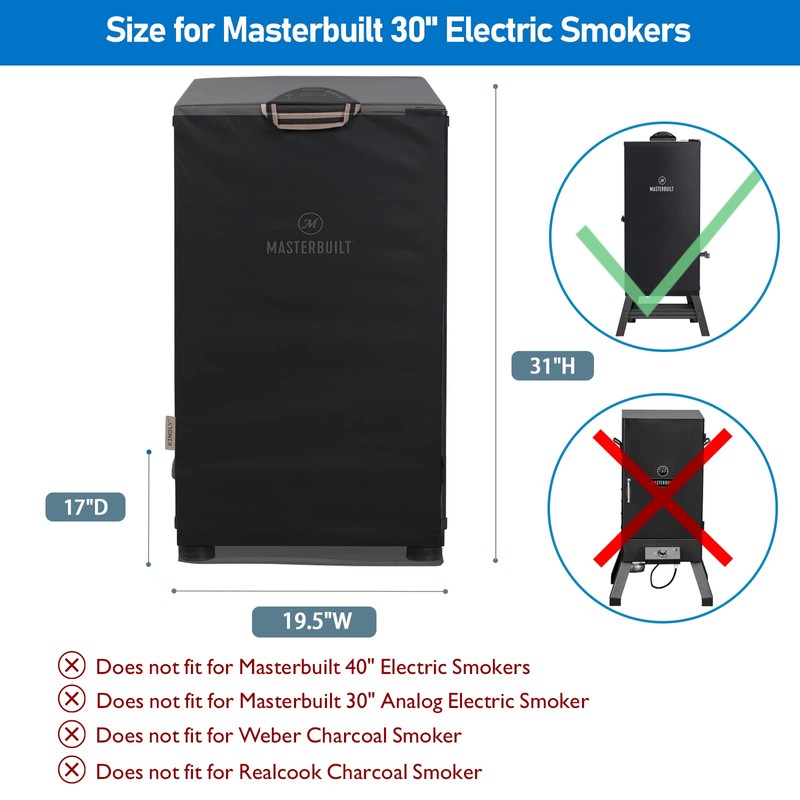 - Smoker Cover SizeCover measures 19.5"W*17"D*31"H,NOT smoker dimension,so it's used for almost most brands of 30"electric smokers,such as Masterbuilt,Smoke Hollow,Camp Chef and more.Note:Be sure to measure your smoker first to determine the proper cover.