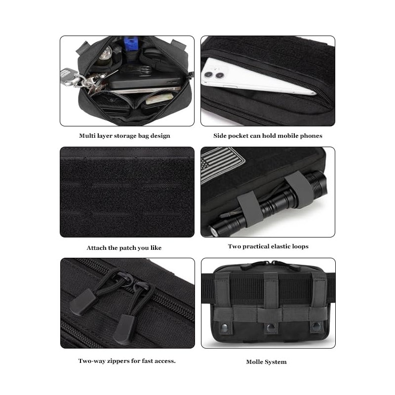 - Smart-Organized Tactical Storage: This MOLLE pouch features a versatile two-tier layout: a quick-access front zipper pocket and a spacious main compartment. Inside, two mesh pockets and adjustable elastic loops securely hold essentials like knives, flashlights, multitools, maps, pens, and medical items. Plus, the bottom includes two elastic loops—perfect for mounting a tourniquet or parachute cord.