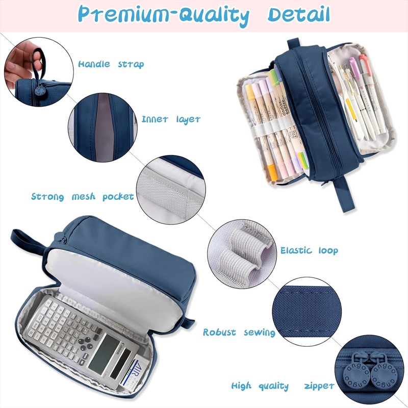 - Fashion and Unique Design:The pencil pounch adopts multi-layer double-opening window design, a total of 4r compartments, partition storage, independent storage, so that many and messy stationery is more organized.Designed with the comfortable handle, allows you to carry pencil cases easily to any occasion, you can also hang the pencil case for easy storage.