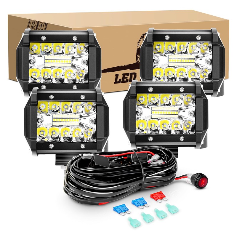 KINGOPT LED Light Bar 4PCS 4Inch 60W LED Spot Flood Light Pods, High Brightness LED Beam with Wiring Harness Kit Fog Lamps Driving Boats Work Lights for Truck Car Golf SUV Motor Jeep Garden Harvester