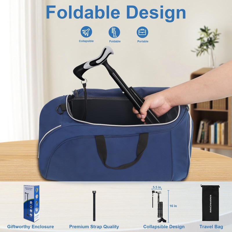 Folding Cane:Folds easily in seconds for compact storage and travel, fitting neatly into the included carry bag