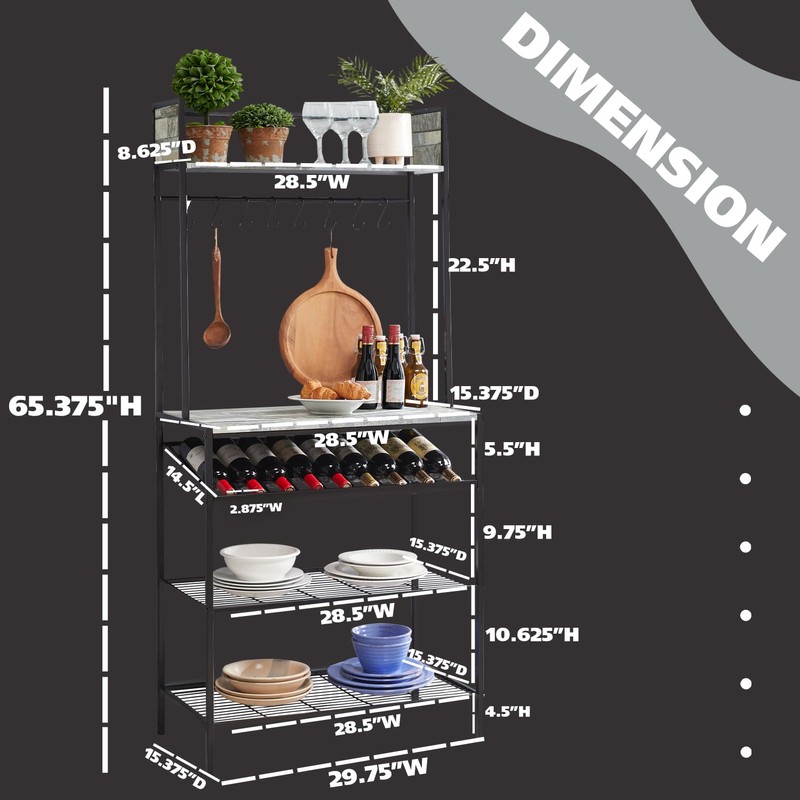 - SIZE AND HOLDING CAPACITY: Our metal bakers rack has an overall height of 65 inches, 15 inches in width, and a length of 30 inches. With its beautiful wood design, the upper shelf provides sufficient space for decorative displays. Two lower shelves constructed from wood with PVC veneer provide additional storage options and hold up to 9 wine bottles in the wine rack. A rod of 8 hooks can be utilized for hanging storage.